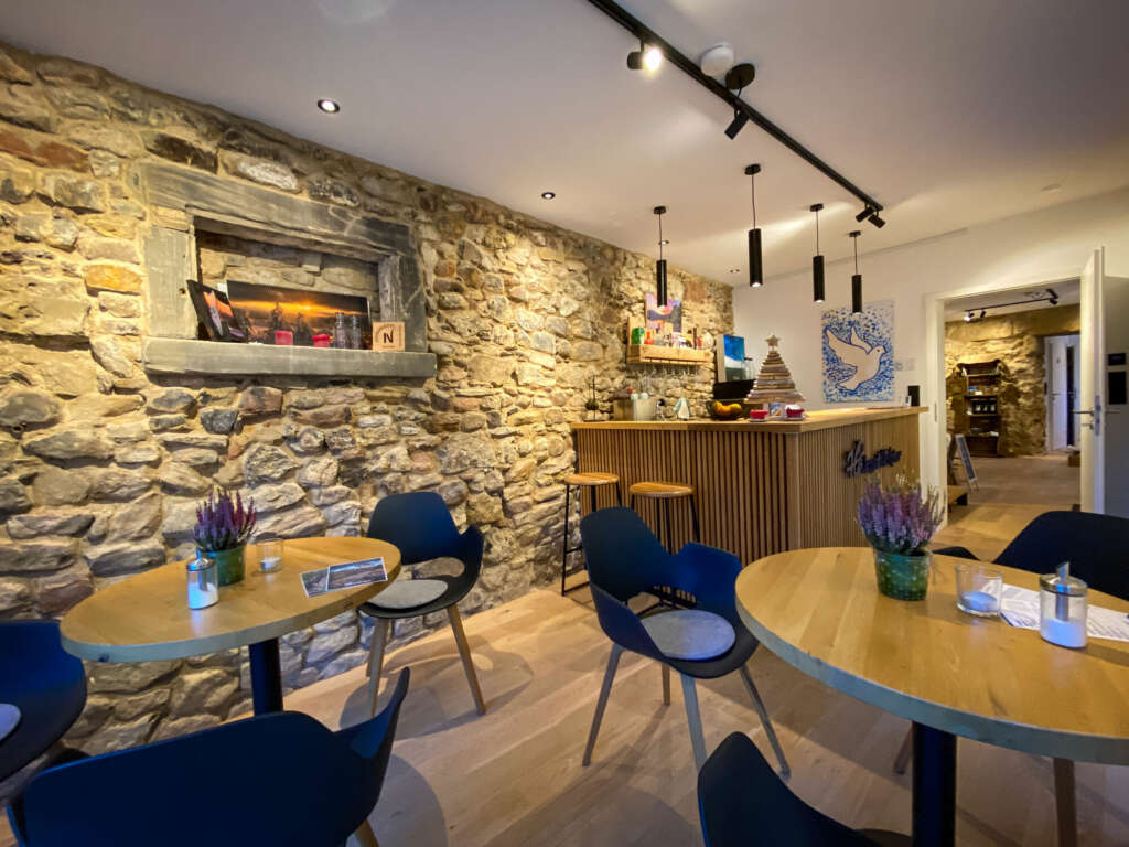In unserem Café bieten wir unseren Gästen feinsten BIO-Espresso und regionale Weine. Neben den ausgestellten Wandbildern können auch Postkarten und andere Produkte erworben werden.